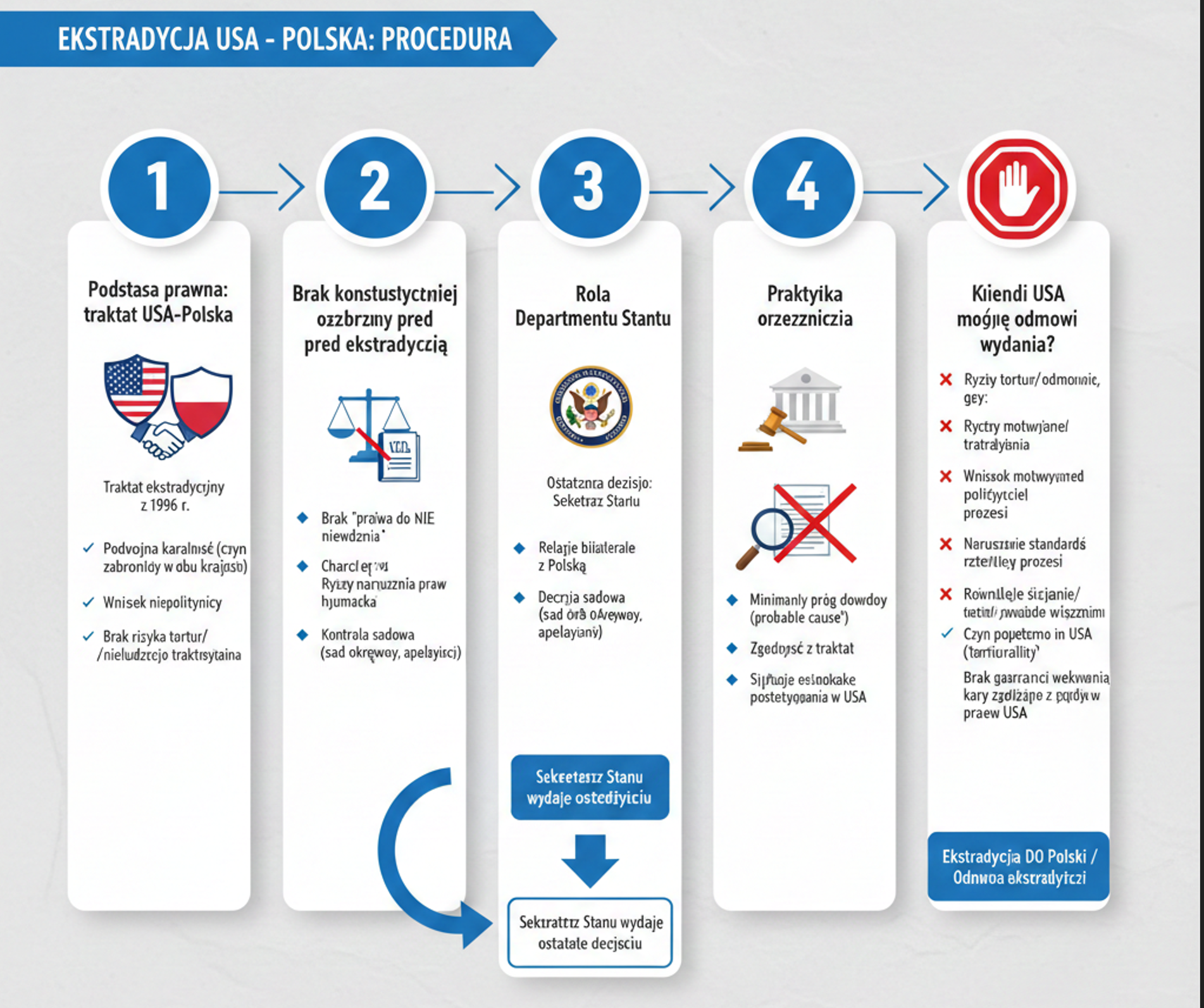 Nawet jeśli sąd federalny uzna wniosek za prawnie dopuszczalny, ostateczną decyzję podejmuje Sekretarz Stanu. Na tym etapie brane są pod uwagę czynniki pozaprawne, m.in.: relacje bilateralne z Polską, charakter zarzucanego czynu, ryzyko naruszenia praw człowieka, sytuacja osobista i zdrowotna osoby ściganej oraz ewentualne równoległe postępowania w USA. W praktyce Departament Stanu nie blokuje ekstradycji tylko dlatego, że osoba jest obywatelem USA. Obywatelstwo może być argumentem pomocniczym, ale nie stanowi przeszkody prawnej. W tym etapie Sekretarz Stanu wydaje ostateczną decyzję, która kończy postępowanie ekstradycyjne po stronie amerykańskiej.